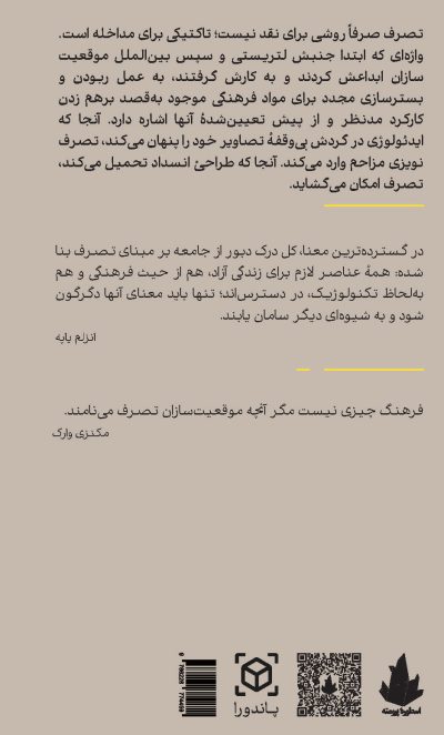 تصرف صرفاً روشی برای نقد نیست؛ تاکتیکی برای مداخله است. واژه‌ای که ابتدا جنبش لتریستی و سپس بین‌الملل موقعیت‌سازان ابداعش کردند و به کارش گرفتند، به عمل ربودن و بسترسازی مجدد برای مواد فرهنگی موجود به‌قصد برهم زدن کارکرد مورد نظر و از پیش تعیین‌شدهٔ آنها اشاره دارد. آنجا که ایدئولوژی در گردش بی‌وقفهٔ تصاویر خود را پنهان می‌سازد، تصرف نویزی مزاحم وارد می‌کند. آنجا که طراحیْ انسداد تحمیل می‌کند، تصرف امکان می‌گشاید.